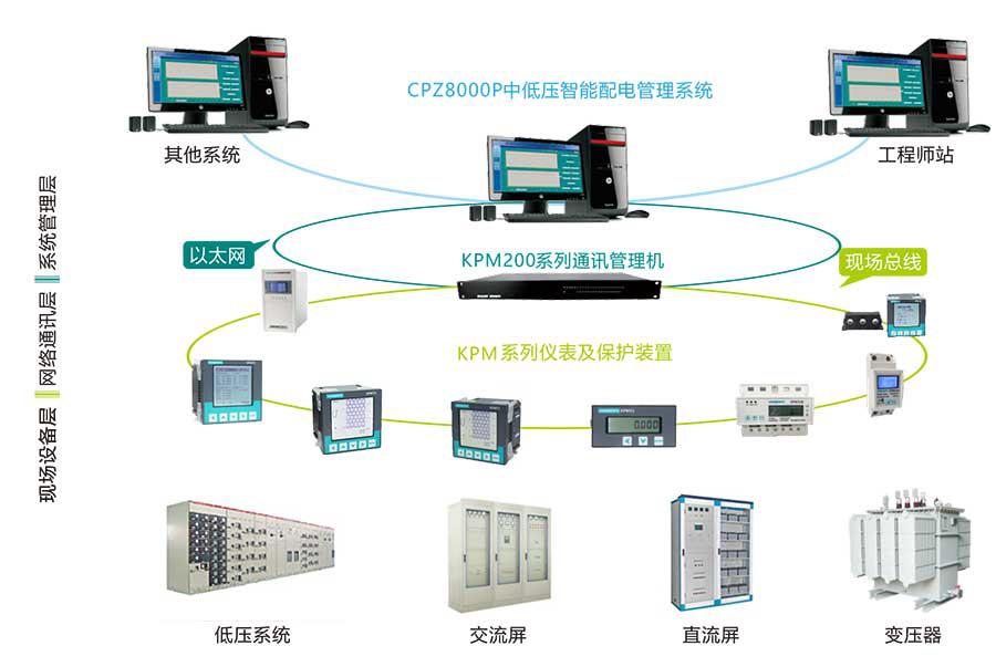 CPZ8000P中低壓智能配電管理系統(tǒng)采用分層、分布式結(jié)構(gòu)設(shè)計(jì),按間隔單元?jiǎng)澐帧⒛K化設(shè)計(jì),整個(gè)系統(tǒng)分為三層:系統(tǒng)管理層、網(wǎng)絡(luò)通訊層、現(xiàn)場(chǎng)設(shè)備層。